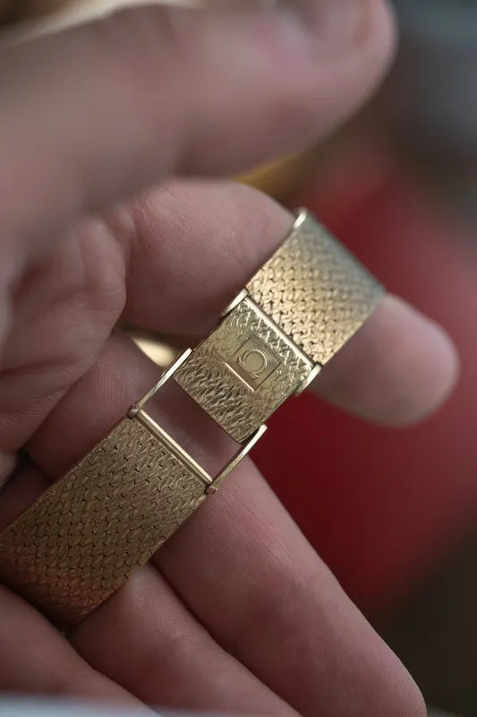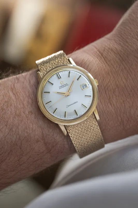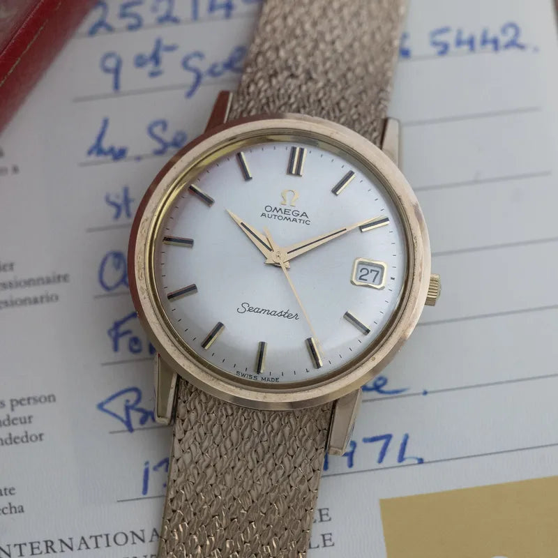 This vintage Omega Seamaster, reference 166.003, crafted in solid 9k gold, is a beautifully preserved example of Omega’s timeless mid-century design. Paired with its original Omega silky-smooth vintage gold strap, the watch exudes understated elegance and the warm character that only true vintage gold can offer.