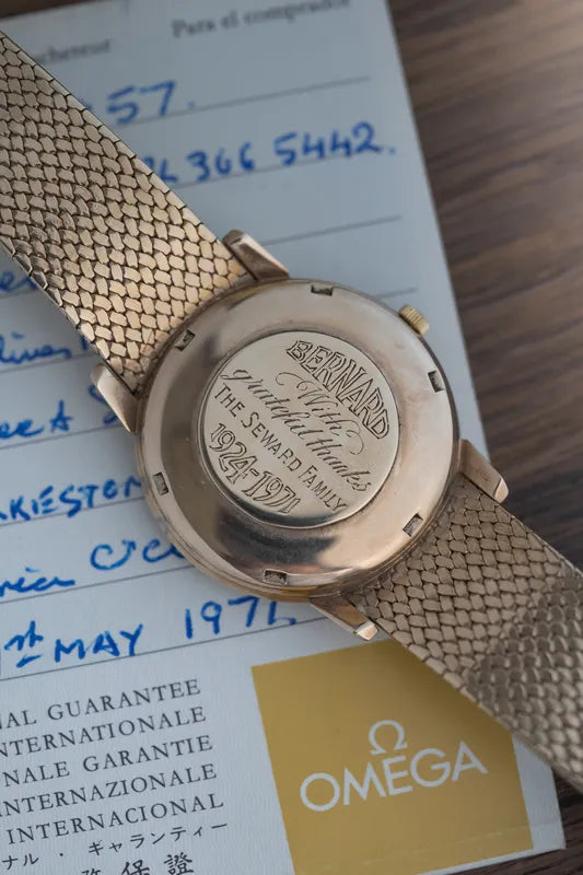 What makes this piece especially remarkable is the completeness of its set including the original box, papers, and even the personalized dedication gifted to its first owner in 1971. It is exceptionally rare to find a Seamaster from this era still accompanied by its full documentation, a testament to the care and pride with which it has been kept.