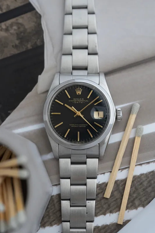 This Rolex Date, reference 1500, is a striking example of understated elegance, blending classic design with a unique and eye-catching dial configuration. The matte black dial immediately draws attention with its velvety texture, a rare and highly sought-after variation that contrasts beautifully against the striking gold hour markers and matching gold hands. This warm, high-contrast combination adds both depth and refinement, giving the watch a timeless appeal that effortlessly transitions from casual to formal wear.
