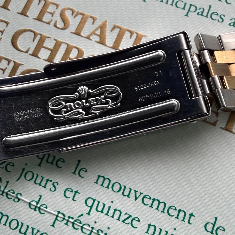 - Bracelet/Strap: Factory original Rolex Jubilee Stainless Steel + 18k Solid gold middle links which have been polishes by our watchmaker back to factory Rolex condition. The bracelet is very tight with only very very light stretch, about as good as I see on these vintage datejusts. Bracelet reference is 62523H18 with 455 endlinks. The clasp is marked J1 which correctly dates the bracelet to the January 1985 The strap comes with full links and will fit an 8 inch wrist