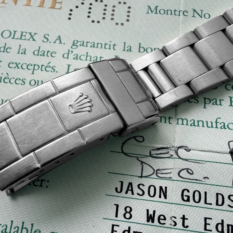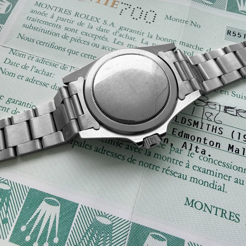 The serial begins with 9.1 dating this watch to 1986 with matching papers along with a correct 1986 clasp code.