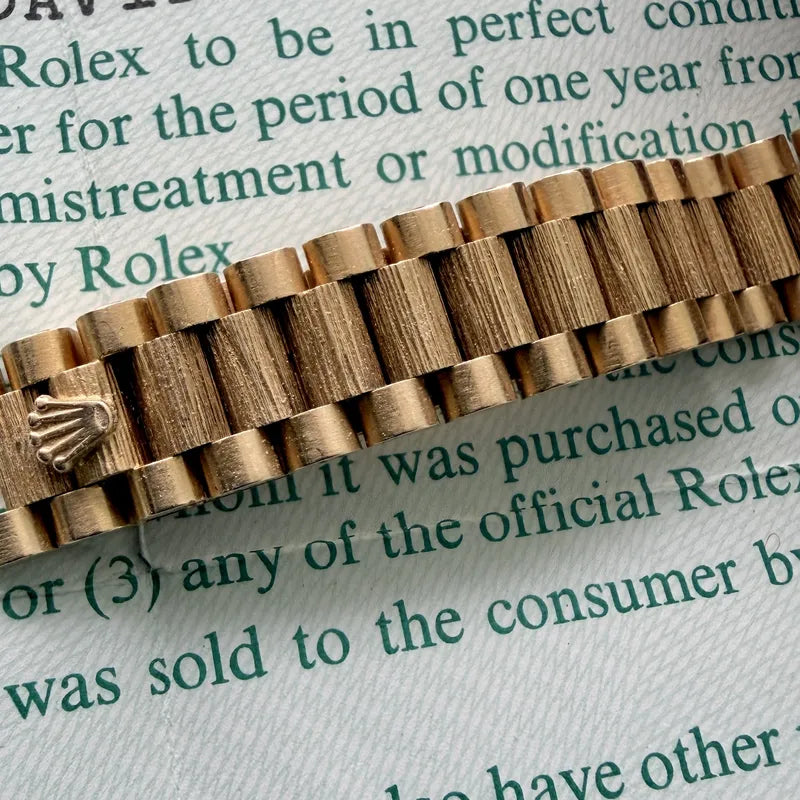 Bracelet/Strap: Factory solid 18 karat yellow gold bark president bracelet which remains unpolished and is in very tight condition. It has nearly no stretch given its age. A truly well taken care of example as many of these bracelets have weak/over polished logos at the clasp whereas this one is bold and pronounced. Bracelet will fit a 6 inch wrist, please ensure to measure your wrist prior to purchase