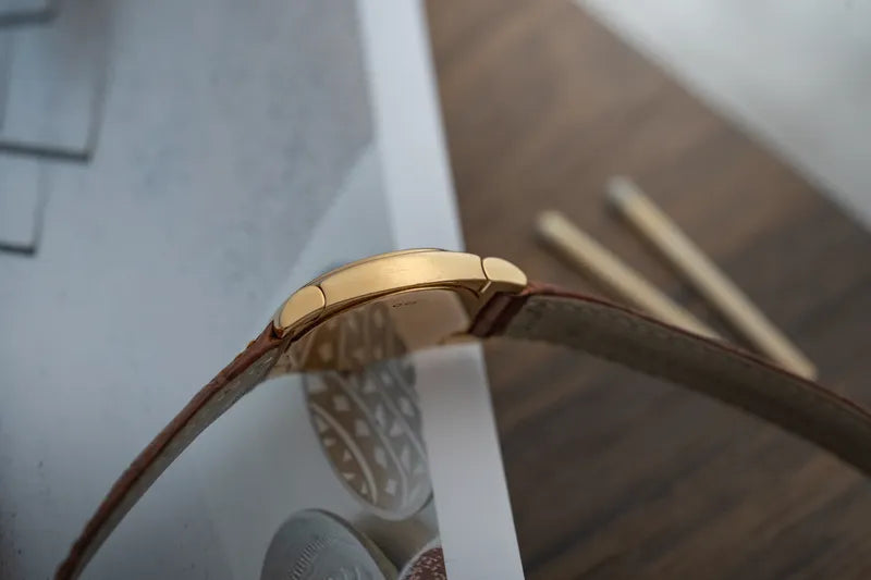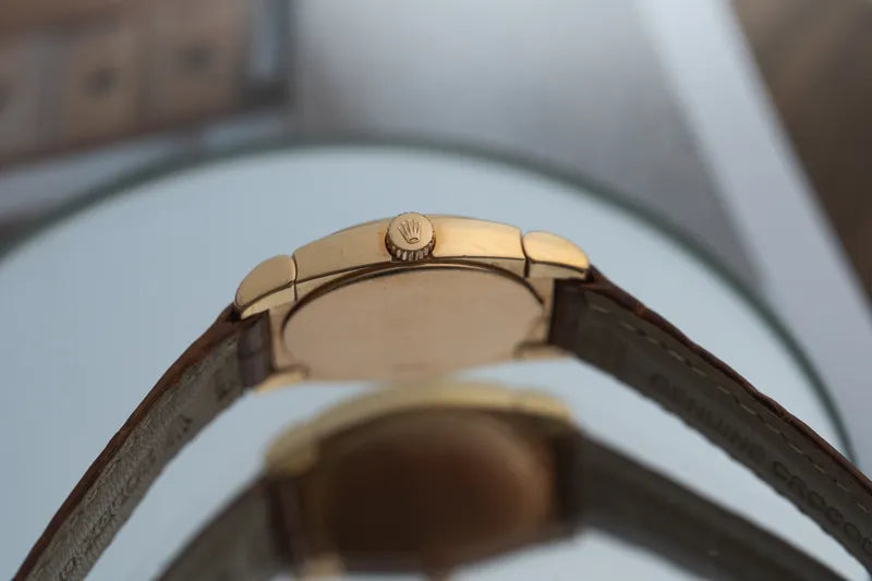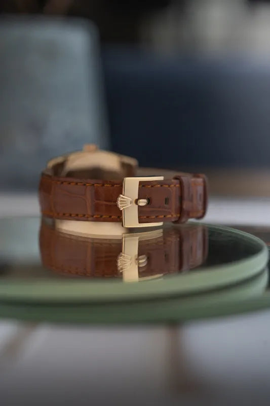 Crafted from solid 18k yellow gold, the round case frames a mesmerizing ivory white dial that exudes simplicity and grace. Paired with its original Rolex brown leather strap and signed gold buckle, this watch offers the perfect balance between subtlety and statement, understated enough for everyday wear, yet undeniably special.