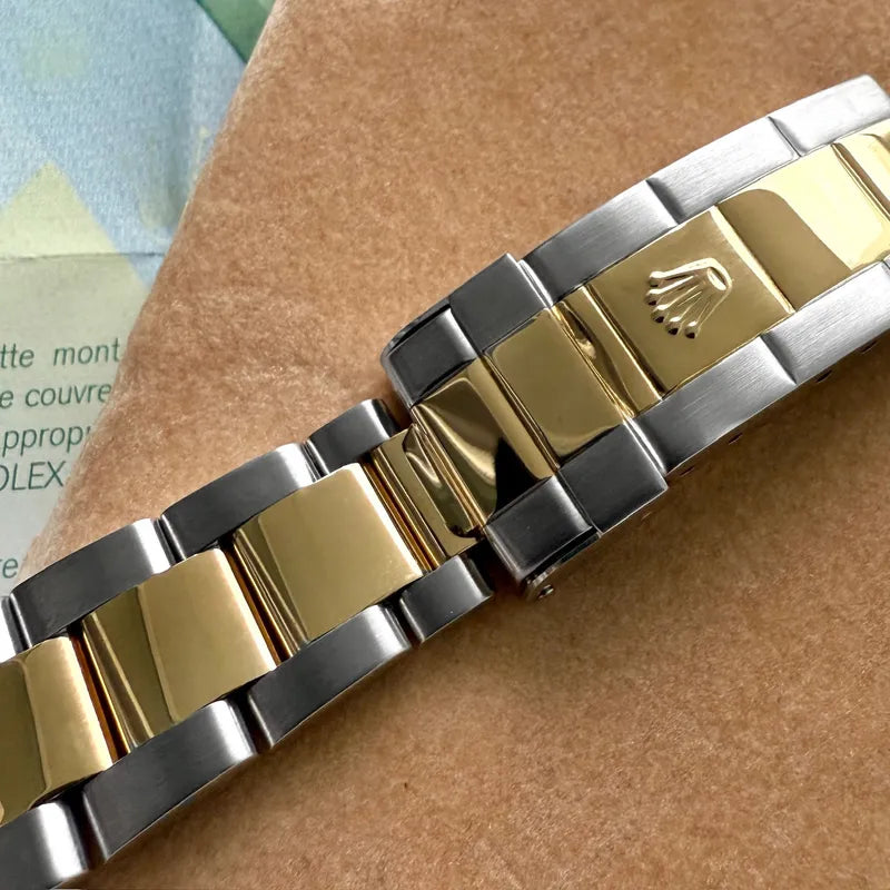 - Bracelet/Strap: Original Rolex oyster stainless steel + 18k solid gold middle links which has been polished by our watchmaker back to factory Rolex condition. This bracelet does not show signs of stretch which is a nice bonus as it is nice strong bracelet. The clasp is marked CL dating the strap correctly to May 2004. The strap will fit an 7.9 inch wrist