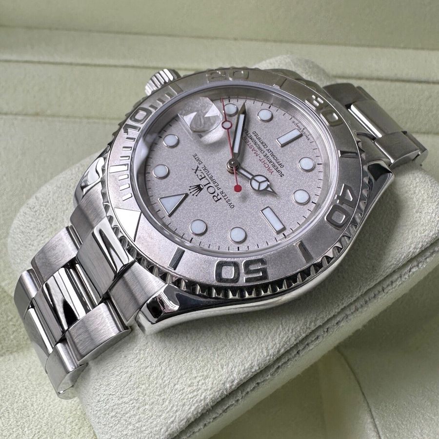Available for sale is a 2006 Rolex Stainless Steel Yachtmaster with a solid platinum bezel, reference 16622. This watch has been serviced in 2017 by Rolex. This watch looks like it was not worn since service. This is a true collector set, it comes with box, warranty card, 2017 Rolex service card/receipt, booklets, hangtag, seal and everything else seen in the photos. Great chance to purchase a discontinued reference at a great price!