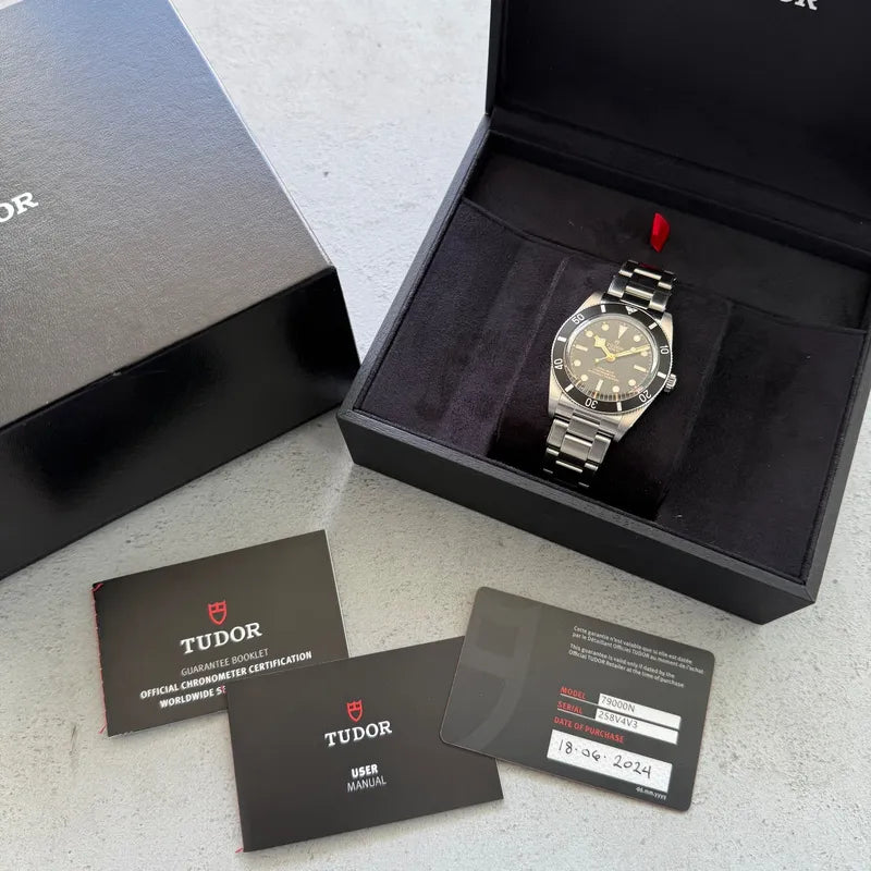 Discover the perfect blend of heritage and modern watchmaking with this Tudor Black Bay 54, reference 79000N. Presented in excellent condition, this timepiece comes as a complete set with its original box and papers, making it an ideal acquisition for both seasoned collectors and new enthusiasts. Its sleek stainless steel bracelet and striking black dial offer a timeless aesthetic suitable for any occasion.