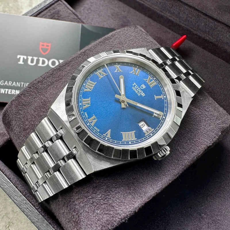 he Tudor Royal reference 28500 is a stunning embodiment of elegance and timeless craftsmanship. This exceptional wristwatch showcases a distinctive blue dial, beautifully adorned with Roman numeral markers that exude refined sophistication.