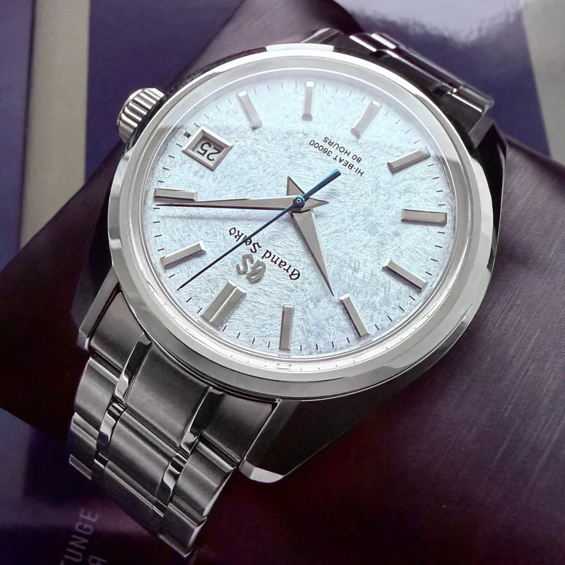 This Grand Seiko Heritage is a beautifully balanced 40 mm timepiece featuring the sought-after snowscape ice blue dial, a finish that looks even more impressive in person. Its textured surface shifts subtly with the light, moving between icy blue, silver, and soft lavender tones - a uniquely dynamic effect that gives the watch remarkable depth and character.