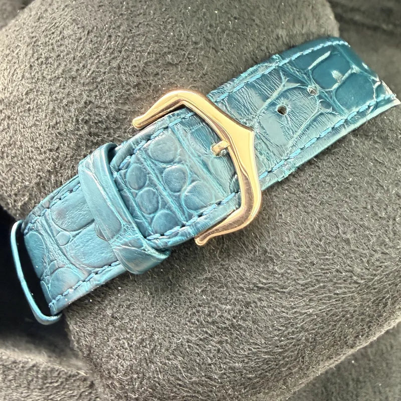 Bracelet/Strap: Factory Cartier peacock blue in attractive condition, it comes complete with factory rose gold buckle showing honest signs of previous wear.