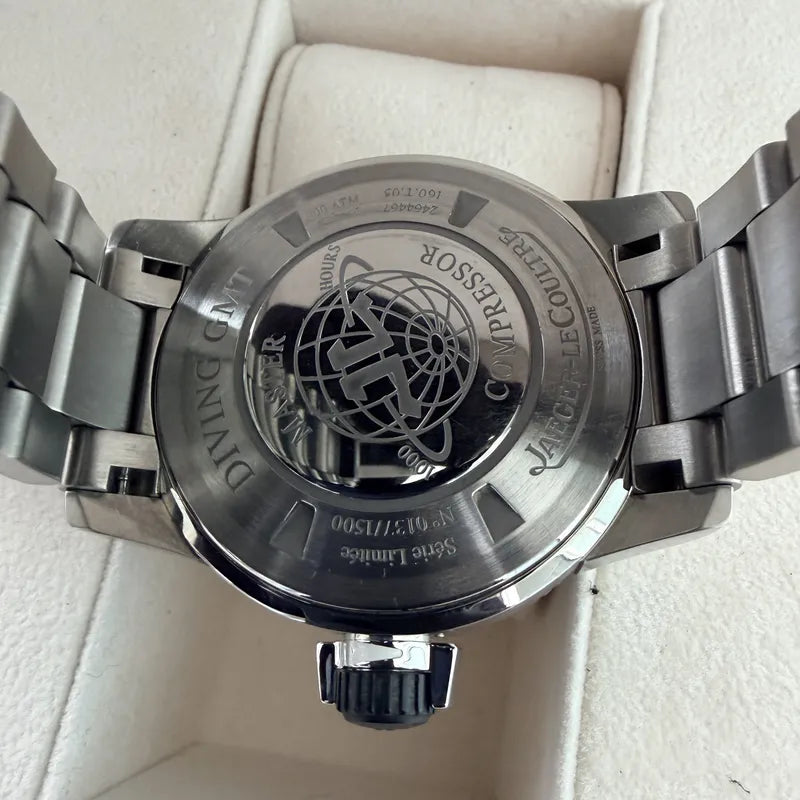 The Jaeger-LeCoultre Master Compressor Diving GMT Titanium, reference 160.T.05, represents one of the most distinctive and technically ambitious tool-watch lines ever produced by Jaeger-LeCoultre. Designed during a period when the manufacture pushed beyond classical dress watchmaking into true professional instrumentation, the Master Compressor series stands apart in the brand’s history for its bold engineering, extreme durability, and unmistakably modern presence. This model features a robust titanium case paired with a solid titanium bracelet, combining serious dive capability with a highly functional GMT complication for tracking a second time zone.