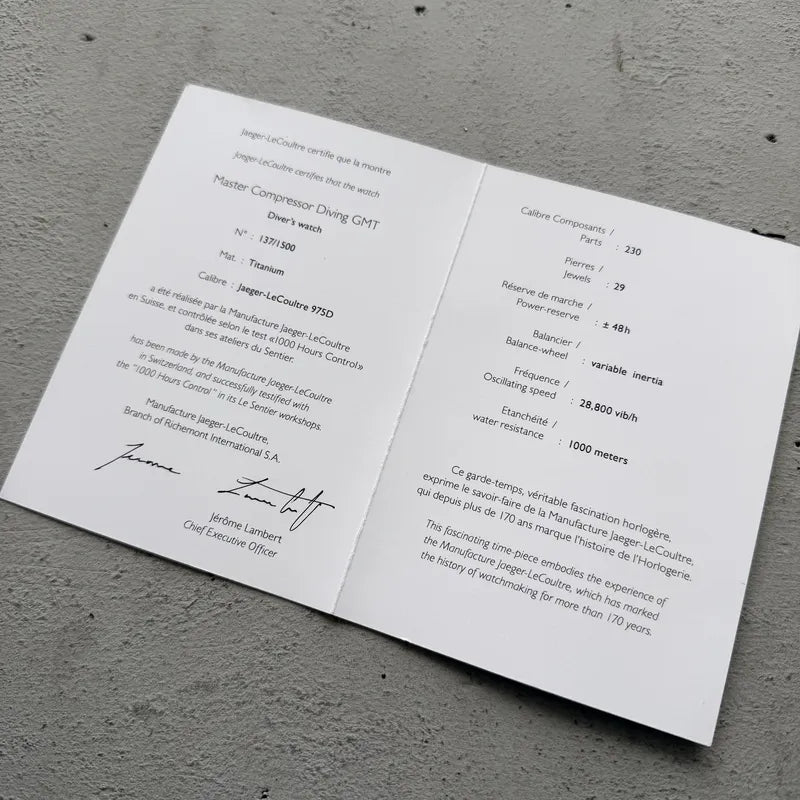 Powering the watch is a high-grade in-house calibre 975D automatic movement, reflecting the manufacture’s legendary technical pedigree, and this example is accompanied by an additional strap that offers versatility beyond the titanium bracelet. As a whole, the Master Compressor Diving GMT is a rare opportunity to own a uniquely engineered chapter of Jaeger-LeCoultre’s catalog—one that blends elite Swiss watchmaking with true sports-watch credibility. For collectors seeking something different from the brand’s more traditional offerings, this titanium Master Compressor delivers presence, comfort, and character in equal measure.