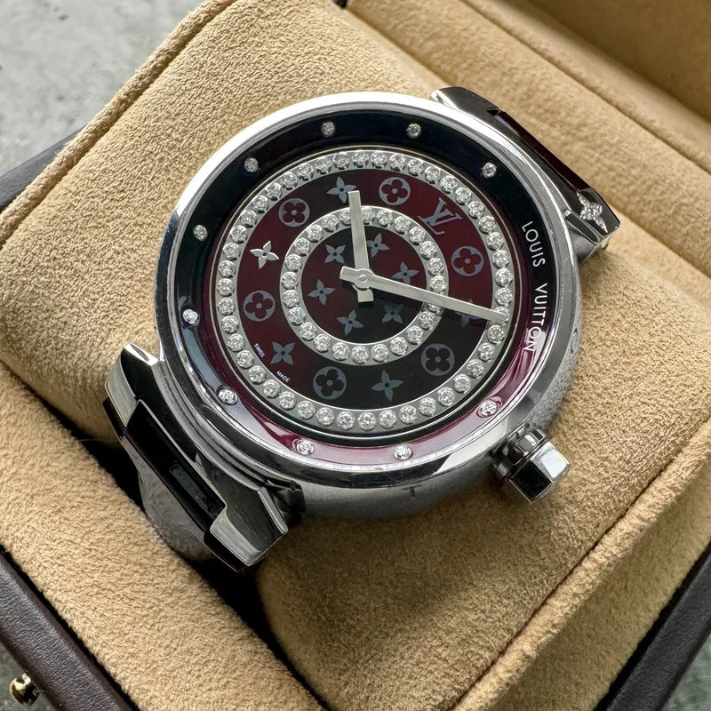 Indulge in the luxury and sophistication with the Louis Vuitton Tambour Amarante wristwatch, reference Q111C. This exquisite timepiece is not merely a watch; it’s a statement of elegance and refined style, designed for the discerning woman who appreciates the finer things in life. With its opulent amarante dial and the unmistakable craftsmanship that Louis Vuitton is renowned for, this watch is a true testament to timeless beauty and modern innovation.