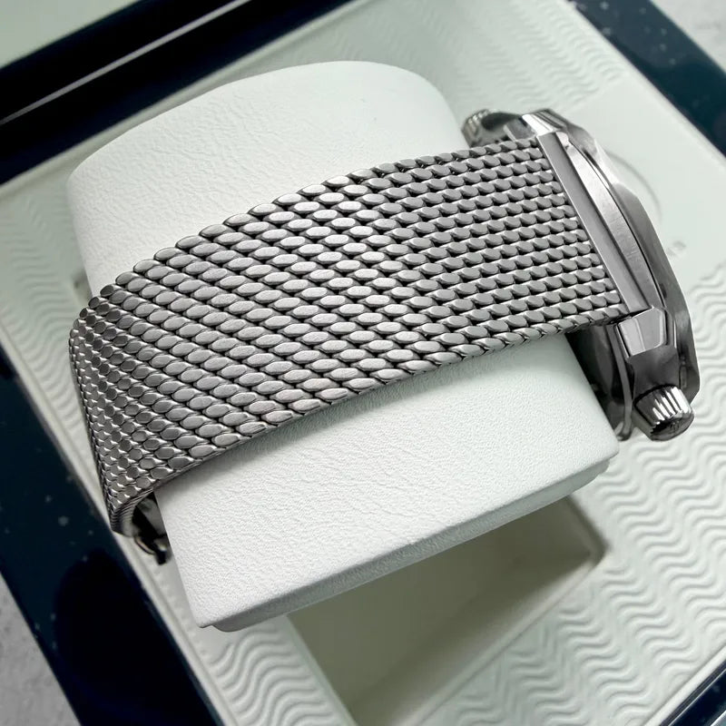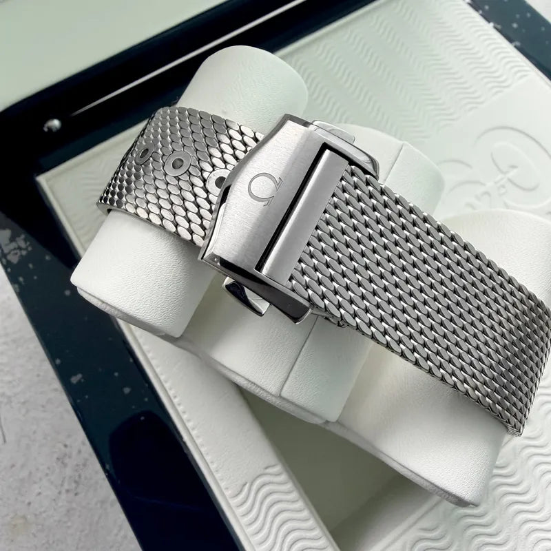 Celebrate six decades of cinematic legend with the Omega Seamaster Diver 300M “James Bond 60th Anniversary” Edition, reference 210.30.42.20.03.002, a timepiece that perfectly blends Omega’s exceptional craftsmanship with the timeless sophistication of 007. This stunning edition stands out with its blue oxalic anodized aluminum dial, elegantly laser-engraved with dynamic wave patterns that shimmer under changing light, evoking the mystery and depth of the ocean. Complementing the dial is a refined stainless steel mesh bracelet, a subtle nod to the style worn by James Bond himself, combining durability with effortless elegance.