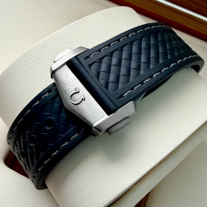 - Bracelet/Strap: Omega rubber with a factory Omega stainless steel buckle. The watch will fit an 8 inch wrist.