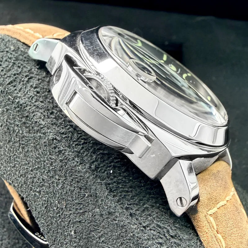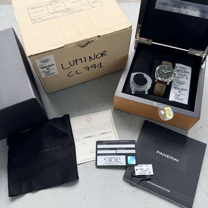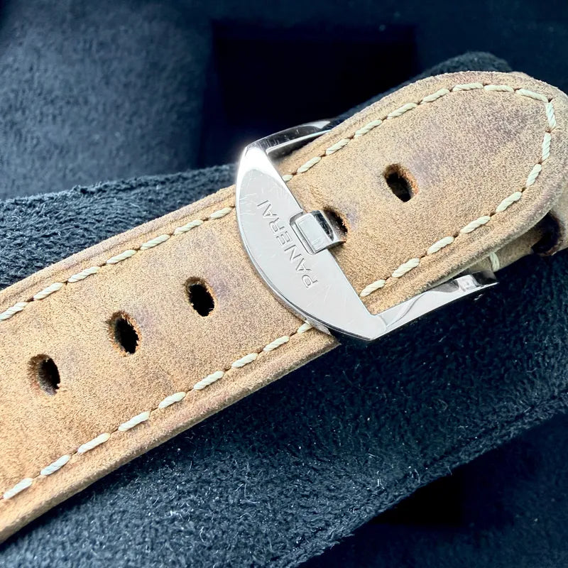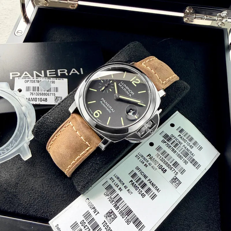 This example is offered complete with its original box and papers and has been freshly serviced by our watchmaker, ensuring it is running to specification and ready to be enjoyed with confidence. The manual-wind movement reinforces the traditional character of the watch, creating a tangible connection between wearer and timepiece. Understated, robust, and effortlessly elegant, the PAM 01048 is an ideal choice for collectors and first-time Panerai owners alike who value authenticity, heritage, and the enduring appeal of a classic Panerai on the wrist.