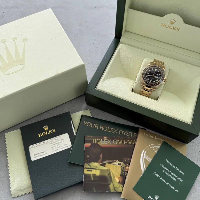 Presenting an exceptional and highly sought-after timepiece: the Rolex GMT-Master II, reference 116718, crafted entirely from solid 18k yellow gold. This watch is the embodiment of prestige and functionality, making a powerful statement of success and worldliness. For the discerning individual who navigates different time zones, this is more than a watch; it is an indispensable travel companion and a symbol of horological excellence.