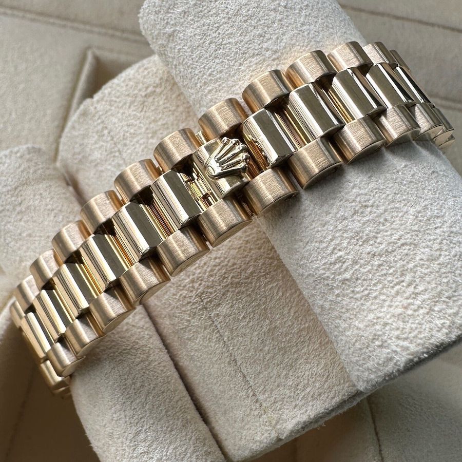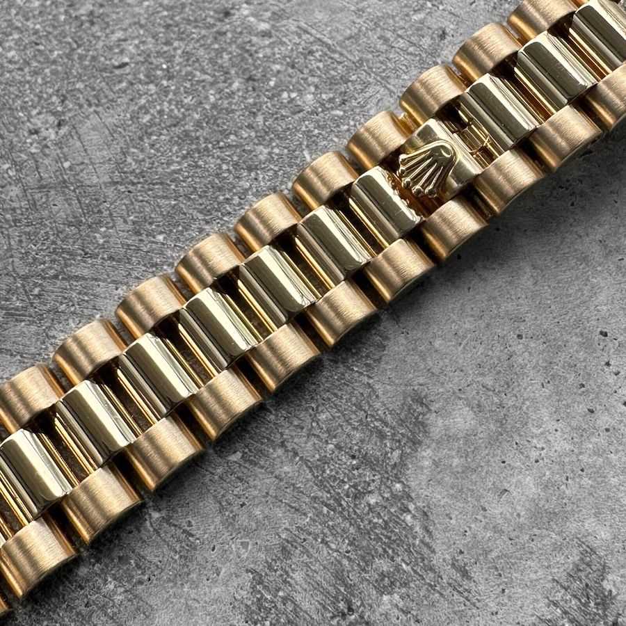 Bracelet/Strap: Factory solid 18 karat yellow gold president bracelet which has been freshly polished by our watchmaker. The bracelet reference is 83138 with E05 dating this bracelet to May 2007. The bracelet has no stretch and will fit a 7 inch wrist.