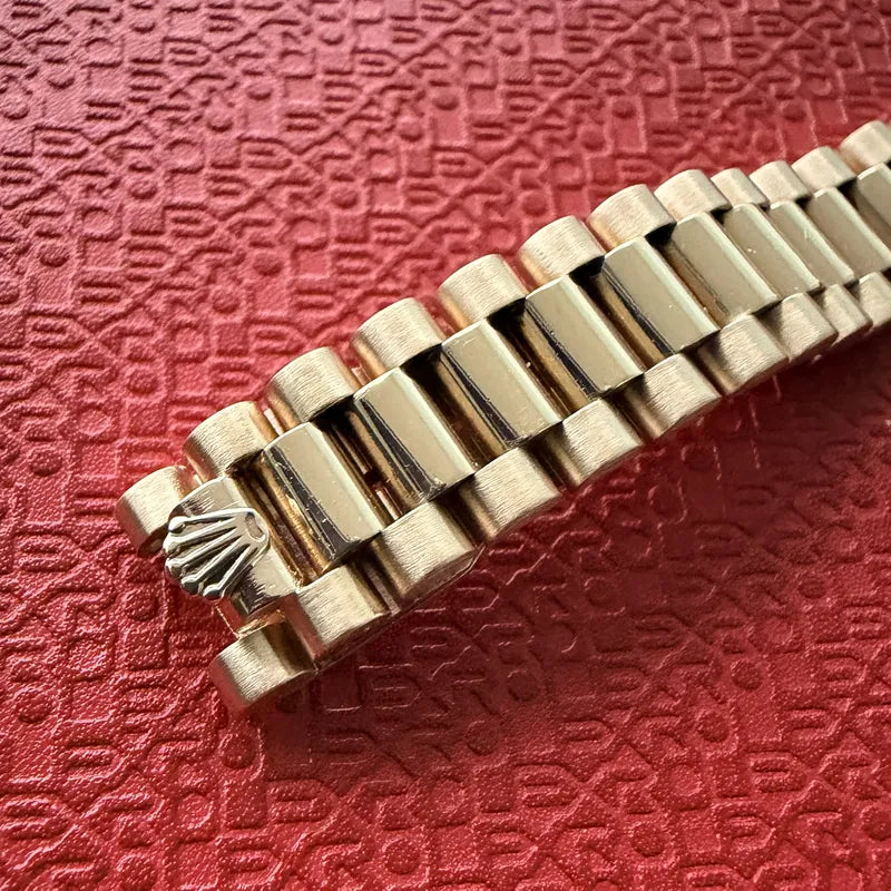 Bracelet/Strap: Factory solid 18 karat yellow gold president bracelet which remains unpolished and is in very tight condition. It has nearly no stretch given its age. A truly well taken care of example as many of these bracelets have weak/over polished logos at the clasp whereas this one is bold and pronounced. Bracelet will fit a 66.9 inch wrist