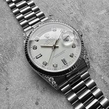 Available for sale is a Rolex President crafted in white gold reference 118339. This watch has factory diamond dial and diamond lugs which is identified by the reference number. The watch has been freshly polished by our watchmaker and serviced. It is ready to be worn!