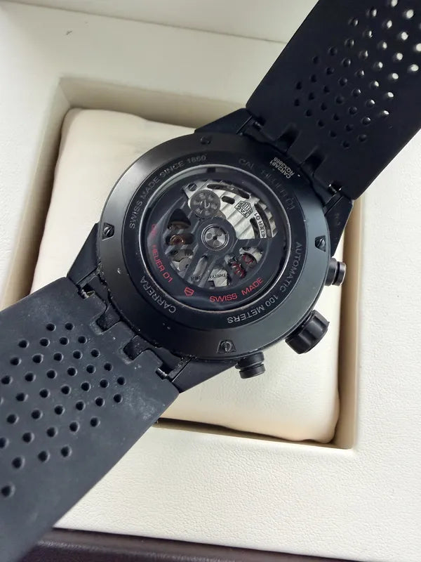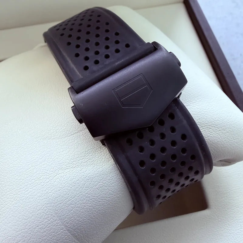 This TAG Heuer Carrera Calibre, reference CAR2A91, is a bold and modern statement piece, presented in a striking full black-on-black configuration that instantly sets it apart. Paired with a comfortable and sporty black rubber strap, the watch exudes contemporary performance and urban sophistication.