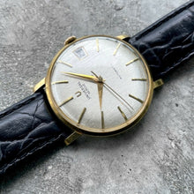 Available for sale is a 1960s Universal Geneve 35mm watch with date-crafted in sold 18K Gold. The dial has a neat linen-like silver finish and has some spotting from age. The watch has a micro-rotor automatic movement. This watch comes with a date feature thus it is not just the simple time-only watches that you typically see from this era.
