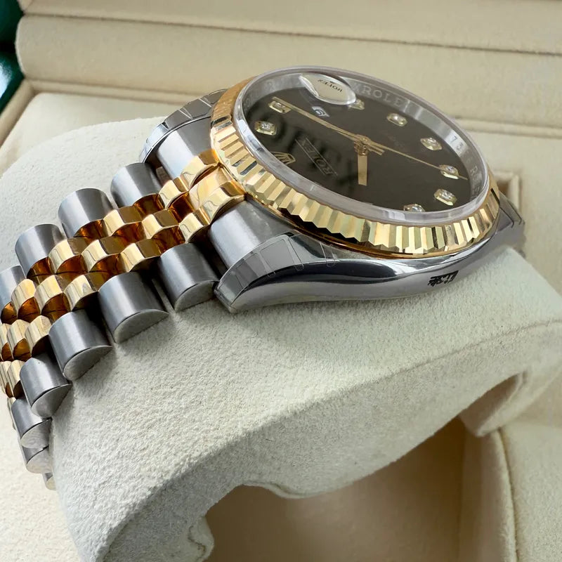 Immerse yourself in the timeless elegance of this stunning Rolex Datejust reference 116233. With its captivating black jubilee diamond dial, this watch is a perfect blend of style and sophistication. Its 36mm case is crafted from a combination of Oystersteel and 18 ct yellow gold, showcasing Rolex’s commitment to using only the highest quality materials.