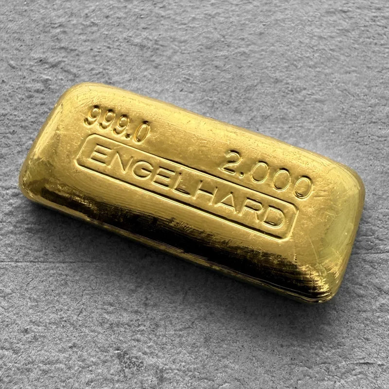Available for sale is a Vintage Engelhard 2 oz Gold poured Bar in nice condition with nice pour lines.